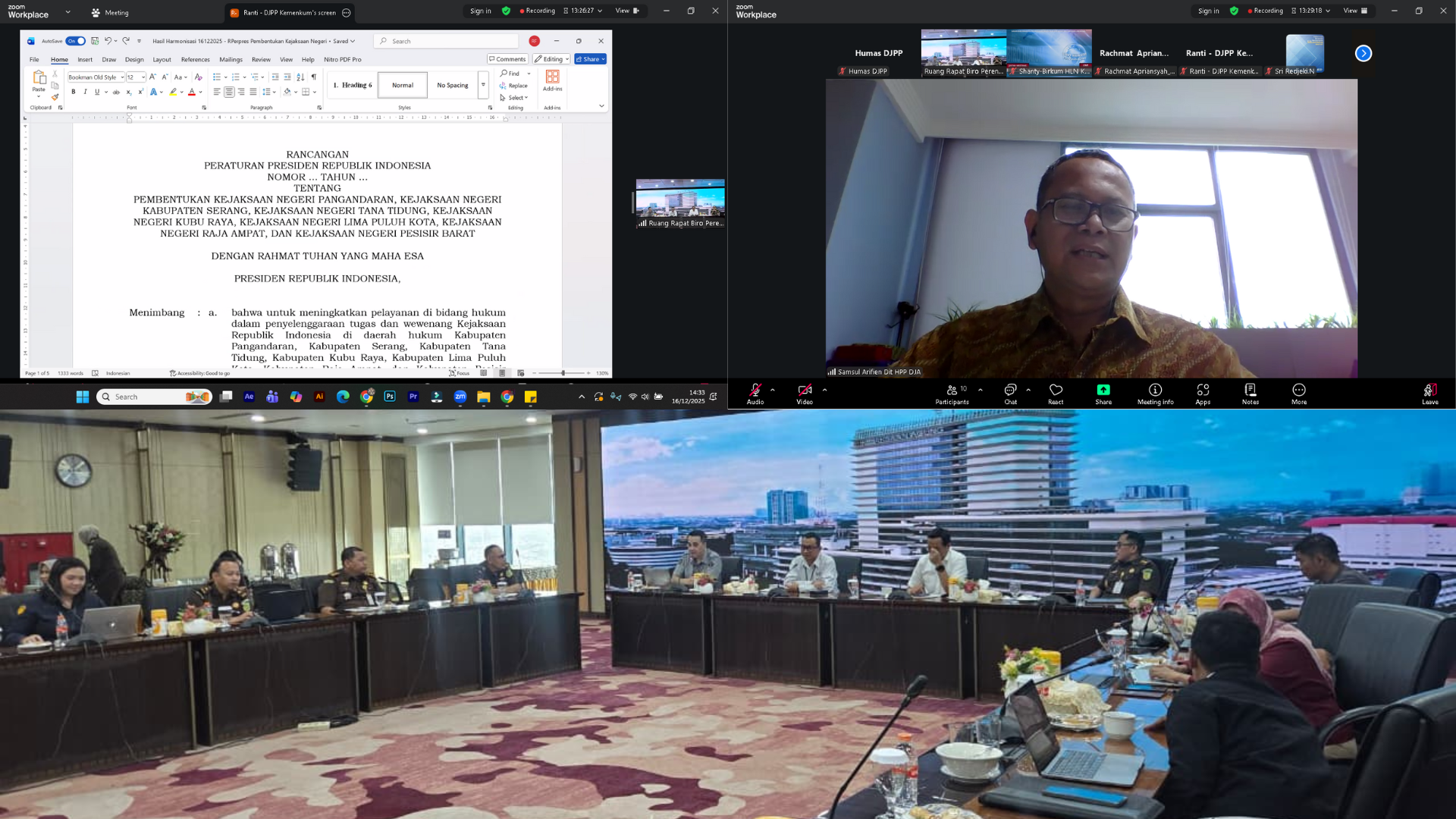Rapat harmonisasi tersebut dilaksanakan secara hibrid pada Selasa, 16 Desember 2025, bertempat di Ruang Rapat Gedung Utama Kejaksaan Agung Republik Indonesia, Jakarta Selatan. Kegiatan dipimpin oleh Perancang Peraturan Perundang-undangan Ahli Madya, Rizki Arfah, setelah sebelumnya dibuka terlebih dahulu oleh Direktur HPP II, Waliyadin. Hadir dalam rapat ini jajaran Kejaksaan Agung, antara lain Kepala Biro Perencanaan dan Plh. Kepala Biro Hukum dan Hubungan Luar Negeri, serta Istiyadi selaku Asisten Deputi Bidang Kelembagaan dan Tata Laksana Kementerian Pendayagunaan Aparatur Negara dan Reformasi Birokrasi.