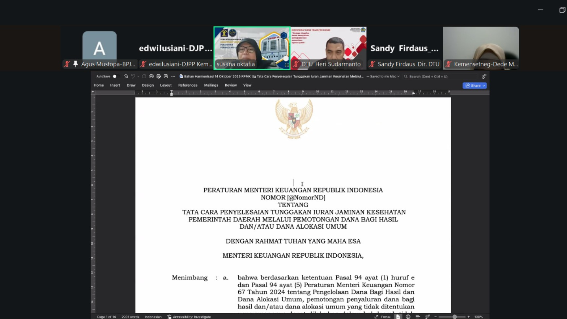 Rapat yang diselenggarakan secara daring ini dibuka oleh Unan Pribadi selaku Direktur Harmonisasi Peraturan Perundang-undangan III. Turut hadir dalam kegiatan tersebut perwakilan dari Kementerian Koordinator Bidang Perekonomian, Kementerian Keuangan, Kementerian Dalam Negeri, Kementerian Sekretariat Negara, Badan Penyelenggara Jaminan Sosial (BPJS) Kesehatan, serta Kementerian Hukum.